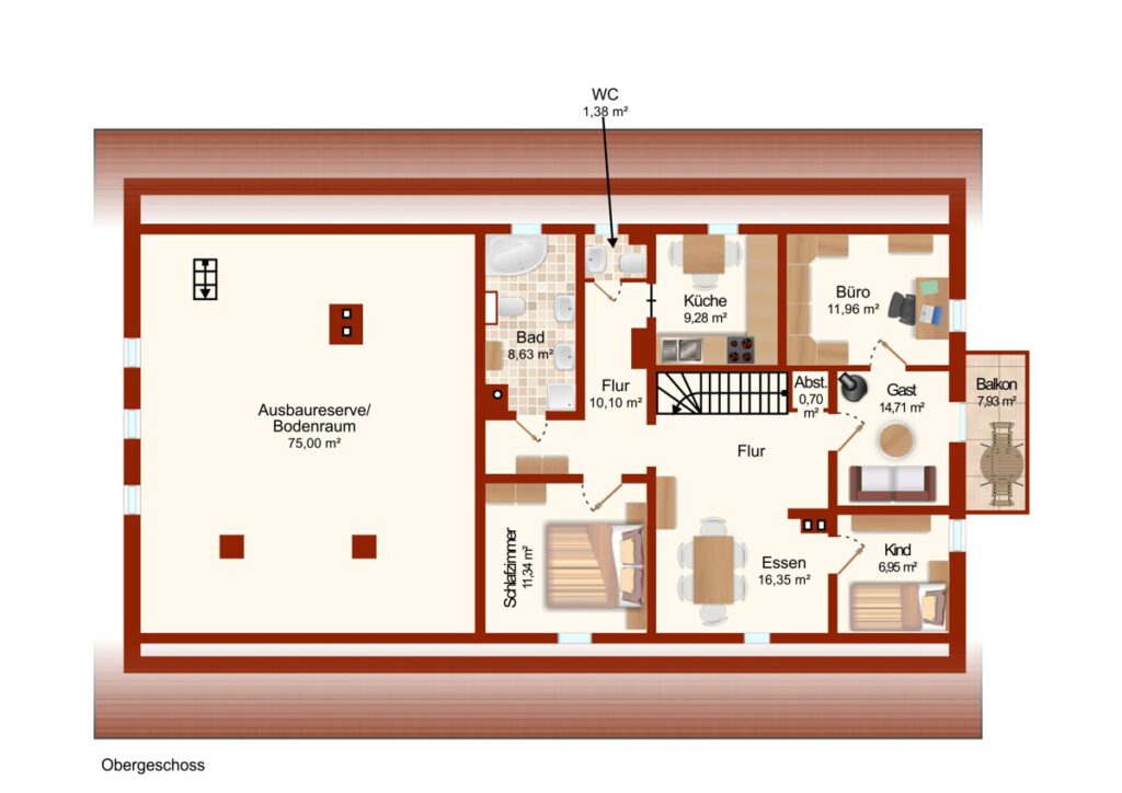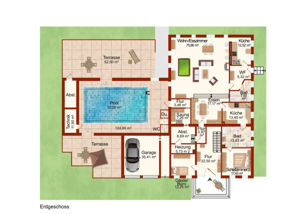 Ein besonderes Highlight ist der Wellnessbereich mit Schwimmbad und Sauna, der ein exklusives Wohngefühl vermittelt. Hier trifft funktionales Wohnen auf gehobenen Komfort.