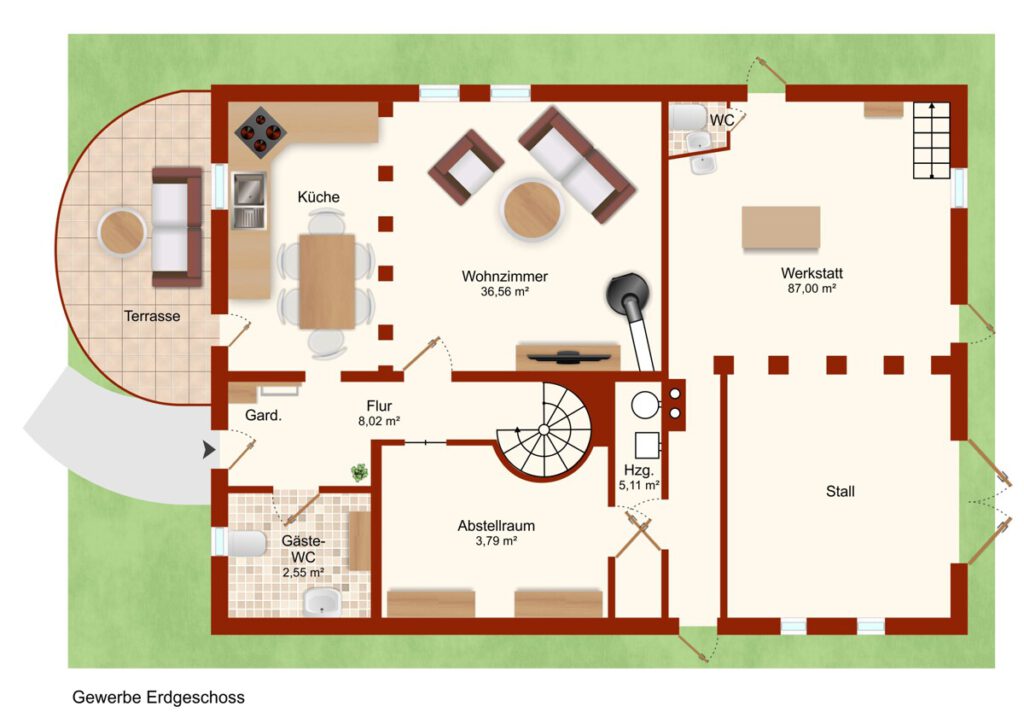 Das Grundstück umfasst beeindruckende 5.053 m² – viel Platz für Freizeit, Gestaltung oder unternehmerische Nutzung. Die große Nutzfläche ermöglicht zusätzlich vielseitige Verwendungsmöglichkeiten, z. B. als Lager, Atelier oder Büroflächen.