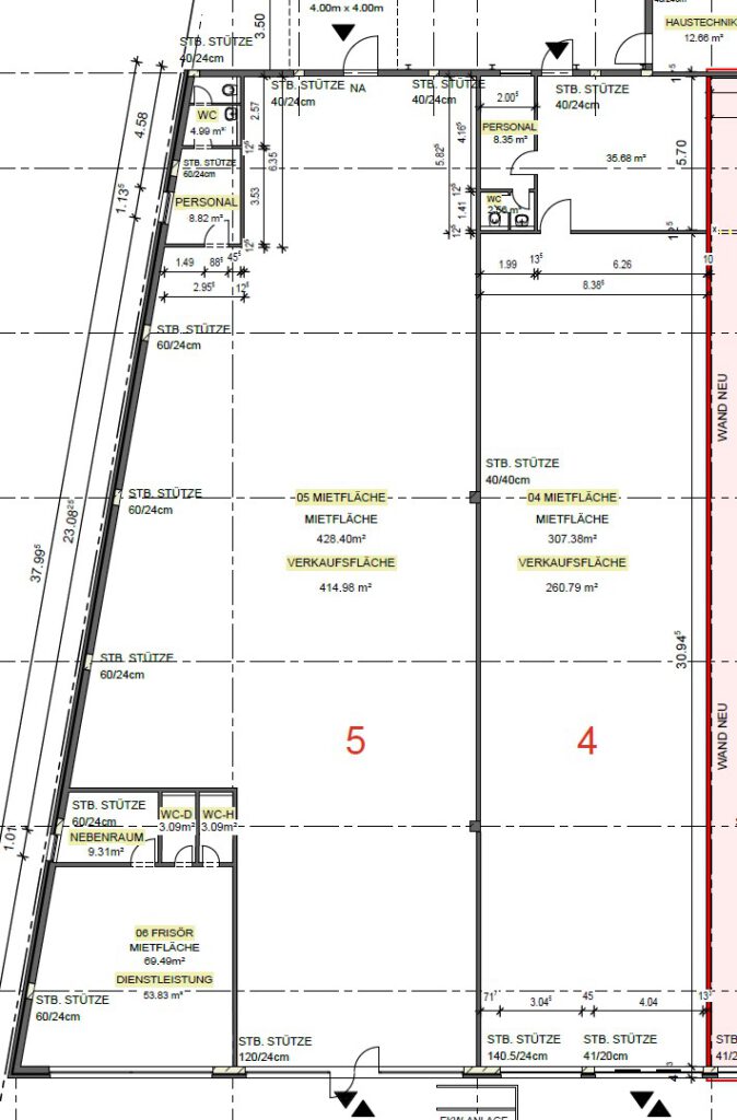 Zusätzlich zur Verkaufsfläche bietet Ihnen dieses Objekt noch mindestens zwei weitere Räume für Personal, Küche und/oder Lager. Sie benötigen noch mehr Gewerbefläche? Ein weiteres Gewerbeobjekt, direkt angrenzend, finden Sie ebenfalls in unserem Bestand mit weiteren 428qm Fläche (Grundriss Nr. 5).