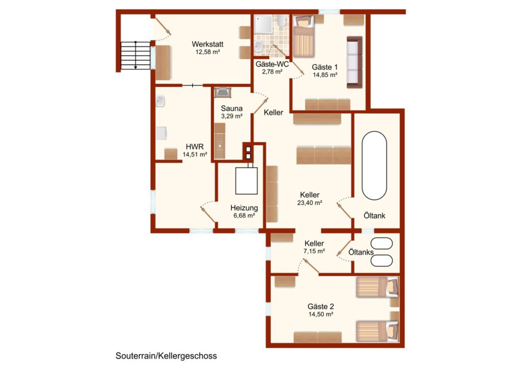 Die Immobilie verfügt über einen großen Garten, mit überdachter Terrasse auf insgesamt 933qm Grundstücksfläche und einer Doppelgarage. Der Keller bietet Ihnen des Weiteren, eine Werkstatt, zwei Gästezimmer, eine Sauna, ein Gäste WC mit Dusche, ein Hauswirtschaftsraum, sowie ein größerer Raum zur individuellen Gestaltung.