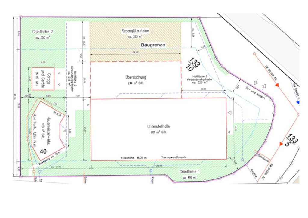 Besonders hervorzuheben sind das bereits genehmigte „Hausmeisterwohnhaus“ sowie die genehmigte Garage.